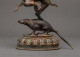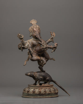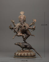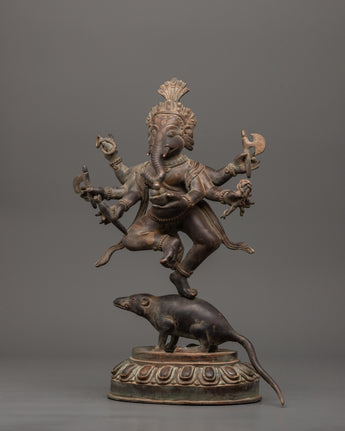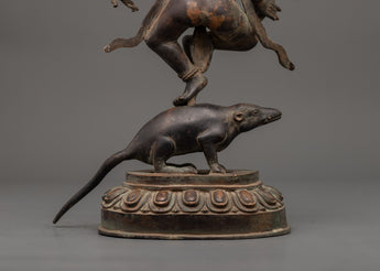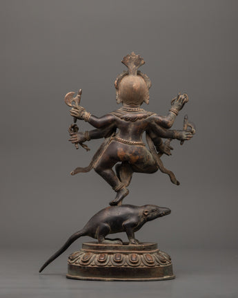 In this magnificent representation, Ganesh rides his sacred mount, the mouse, which is situated on a lotus petal throne, symbolizing purity and spiritual elevation. The meticulous craftsmanship of his six arms, each holding symbolic tools, animates the sculpture, transforming it from a beautiful object into a spiritual treasure meant to bring peace and wealth into your life.