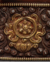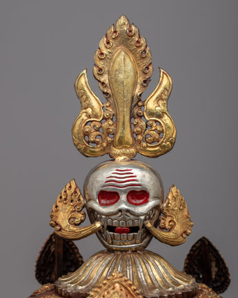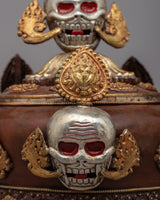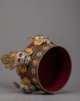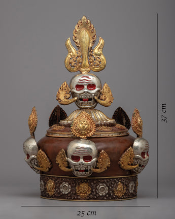 The Skull Crown, reveals the mystique of Tibetan craftsmanship. This stunning crown is 37 cm tall and was expertly handcrafted from copper with 24k gold and silver plating. Its seamless blending of tradition and extravagance is proof of time-honored craftsmanship and cultural legacies.