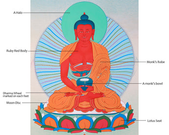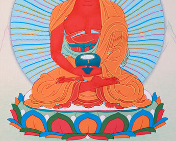 The Buddha of Infinite Light, revered in Pure Land Buddhism for his boundless compassion and guidance towards enlightenment, is beautifully depicted in this Small Amitabha Buddha Thangka. Crafted on canvas using vibrant acrylic colors and enhanced with pure 24K gold, this piece offers a compact yet powerful representation of Amitabha's serene and luminous presence.