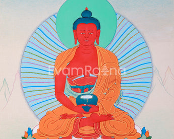 Amitabha Buddha is depicted sitting calmly on a lotus throne with his hands positioned in the Dhyana Mudra, symbolizing balance and meditation. His enlightened state is emphasized by the intricate details of his garments and the glowing halo surrounding him. The 24K gold accents add depth and richness to the composition, highlighting the Buddha's magnificent radiance.
