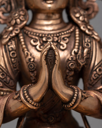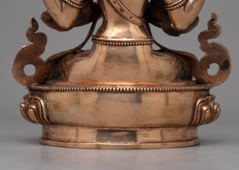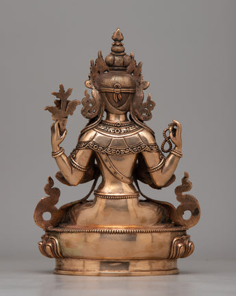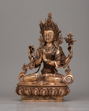 In the Buddhist tradition, the Statue of Chenrezig, also called Avalokiteshvara, is revered as a source of kindness and knowledge. This statue is carefully handcrafted on a copper body, a material selected for its durability and spiritual importance, with regard and attention to detail. The 24cm-tall monument, which personifies Chenrezig's divine attributes, invites followers to engage with the infinite wisdom and compassion he stands for.