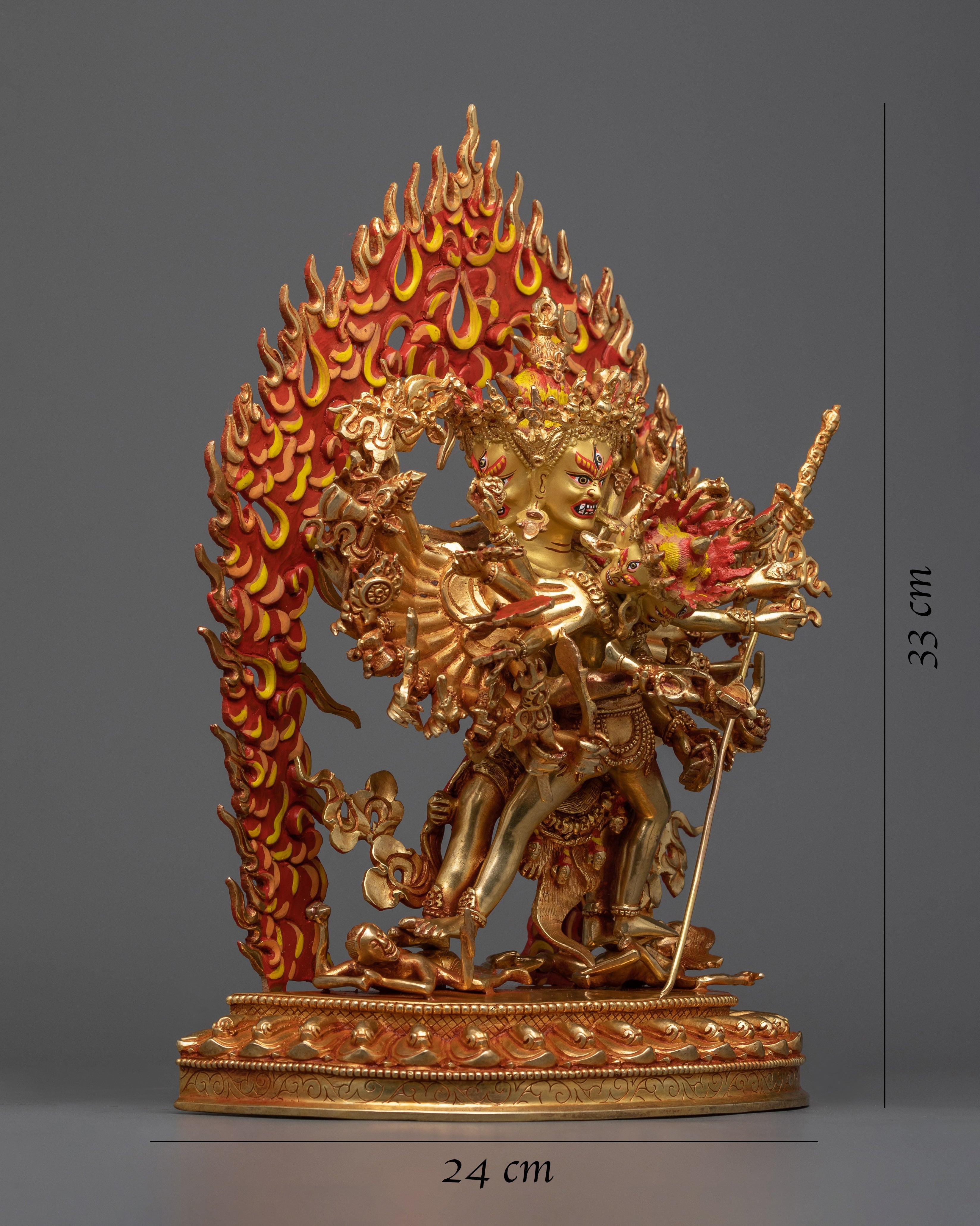 Invite the Kalachakra statue's beauty and mystical charm into your sanctuary. This sculpture, a testament to genuine Nepalese craftsmanship, serves as a link to generations of wisdom and tradition. Its sumptuous coat of 24k gold, embellished with beautiful acrylic paintings, exudes a sublime elegance that beautifies and sanctifies the space it resides.
