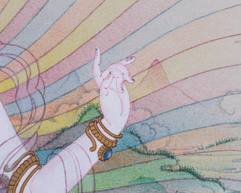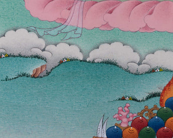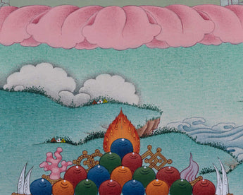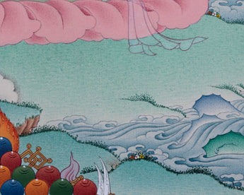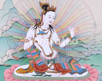 Immerse yourself in the divine presence of our Meditation Dakini Sukha-Siddhi Thangka, a masterpiece handcrafted on a luxurious cotton canvas. Every brushstroke unveils the ethereal beauty of Sukha-Siddhi, the Meditation Dakini, capturing the essence of her blissful and meditative grace. Painted with natural stone colors, the canvas exudes a grounding and timeless vibrancy, inviting a deep connection with the tranquil qualities of meditation. What sets this thangka apart is the infusion of genuine 24K gold, delicately applied to illuminate Sukha-Siddhi's form, casting a radiant glow that symbolizes the transcendent qualities associated with her enlightened state. This harmonious fusion of natural stone colors and gold transforms the thangka into a sacred portal, offering not just art but a pathway to serenity and spiritual elevation. Adorn your sacred space with this exquisite creation, and let the radiant energy of Sukha-Siddhi inspire your journey into the profound realms of meditation and inner tranquility.