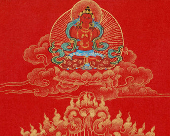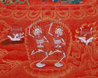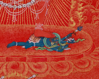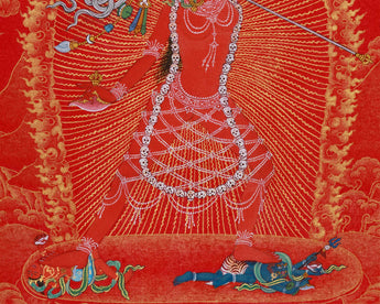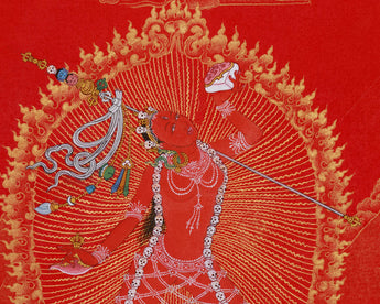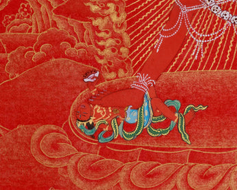 Made on canvas, this piece of art exhibits the meticulous dedication to detail of skilled artisans. A bright brilliance is added to the delicate details by the use of genuine 24K gold, emphasizing Vajrayogini's celestial form, her ornaments, and the sacred symbols that surround her. Symbolizing passion turned into enlightenment, the rich crimson background painted with vivid acrylic colors produces a stunning contrast that accentuates the traditional Nakthang artistry. The cotton canvas's inherent texture guarantees longevity and authenticity, and the harmonic combination of colors and gold produces a work of art that perfectly embodies Vajrayogini's spiritual force. Every component is illustrated in accordance with the traditional meditation books, guaranteeing both spiritual integrity and artistic accuracy.