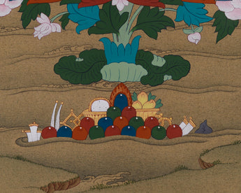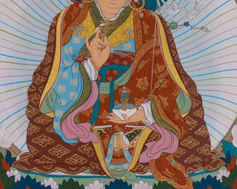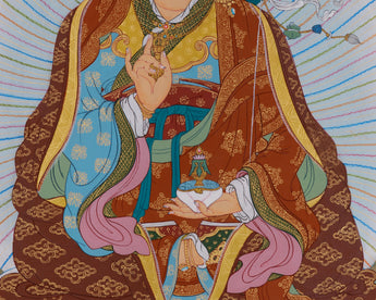 The Tantric Master Guru Rinpoche Thangka is meticulously painted on premium cotton canvas using acrylic colors and genuine 24K gold. This thangka is painted by hand in the traditional Karma Gadri style, which is renowned for its exquisite symbolism, vivid colors, and meticulous attention to detail. The traditional Tibetan painting technique known as Karma Gadri places a strong emphasis on spiritual symbolism, clarity, and simplicity, making sure that every element of the artwork adds to the deity's divine presence. The style focuses on clean lines, harmonious compositions, and the vivid application of colors, particularly gold, to enhance the aura of the subject.