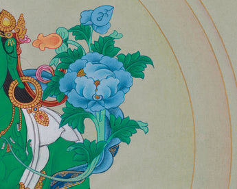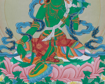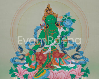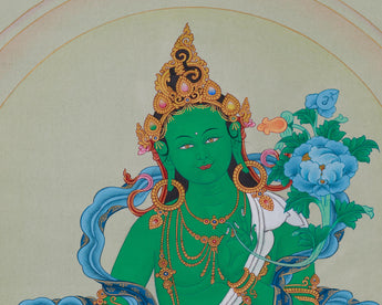 Arya Tara Thangka is hand-painted with natural stone colors and adorned with 24K gold, showcasing the traditional Karma Gadri Style. It is a striking piece suitable for any sacred space or home decor, exuding spiritual elegance and creating a serene atmosphere.