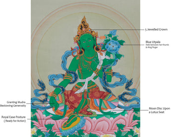 Arya Tara, the deity of compassion and swift protection, is depicted with grace and power. Her right hand extends in the gesture of supreme generosity, symbolizing her willingness to grant blessings and aid, while her left hand, holding a lotus flower, signifies her role as a guardian against fears and obstacles. Her green color symbolizes active compassion and vibrant energy, representing her readiness to take swift action to alleviate suffering. She is revered for her ability to swiftly respond to prayers, embodying qualities of compassion, protection, and the power to overcome challenges.