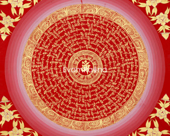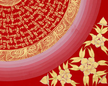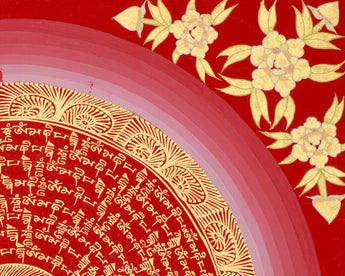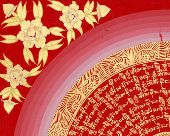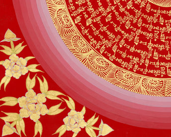 Immerse yourself in the serene beauty of this Thangka of Mantra Mandala, a sacred Tibetan artwork that illustrates the renowned 'Om Mani Padme Hum' mantra. This Mandala is hand-painted spiritual art by a skilled Nepali artist trained in traditional Tibetan thangka techniques. The base is high-quality cotton canvas, carefully selected for its firmness and ability to capture the intricate details of sacred writing. The artist employs rich layers of acrylic to create a brilliant red background and floral decorations, thereby enhancing the piece's symbolic depth and vibrancy. Genuine 24K gold is carefully added to each mantra, giving it a brilliant glow that enhances both its visual appeal and spiritual power.