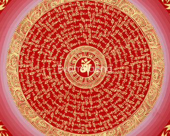 At its core is the sacred phrase "Om," the sound of creation, radiating in golden circles that channel Avalokiteshvara's energy, the Bodhisattva of Compassion. The concentric pattern directs attention inward, serving as guidance to spiritual clarity, inner calm, and loving behavior. The precise writing and sacred geometry reflect significant ceremonial importance, making this Mantra Mandala an excellent spiritual aid for meditation rooms, altars, and sacred spaces. The floral designs symbolize harmony and the cyclical rhythm of life, while the golden phrases cleanse negative karma and align the heart chakra with divine compassion.