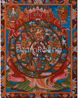 The Buddhist Wheel of Life Thangka offers a deep and respected visual journey through the cycle of Samsara, illustrating the continuous process of birth, death, and reincarnation. Diligently enhanced with authentic 24K gold accents and hand-painted with acrylics, this Thangka represents the Buddha's timeless teachings, serving as both a stunning piece of art and a source of spiritual guidance.