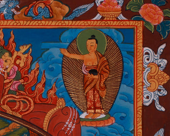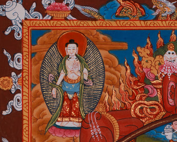With 24K gold highlights applied to crucial features of the artwork, such as the Buddha's figure and symbolic motifs, this Thangka is both a powerful meditation tool and a bright statement of wisdom. The golden accents glow brightly, illuminating the spiritual teachings and providing a glimpse of the divine light that leads out of Samsara.