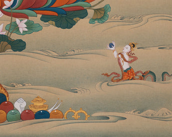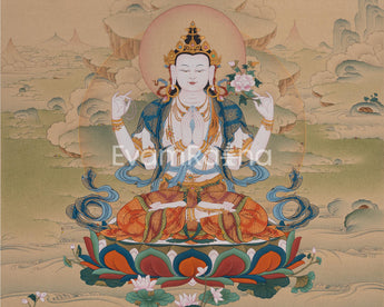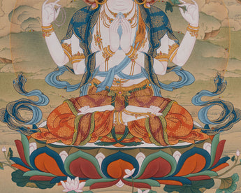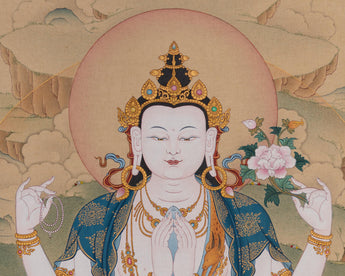 Our exclusive Four-Armed Chenresig Thangka invites you into the world of infinite compassion, masterfully portrayed through 24K gold and natural Lhasa stone hues. Carefully hand-painted on cotton canvas, this sacred artwork depicts Chenresig, the Buddha of Compassion, in his renowned four-armed posture, extending protection and loving-kindness to all beings. Each aspect of the Thangka, from the vivid colors to the shimmering gold details, enhances the energy and grace of Chenresig, making it an essential piece for meditation and contemplation. Created in the Karma Gadri tradition, this unique artwork follows conventional iconographic principles, ensuring a profound spiritual connection and authenticity for those aiming to draw upon Chenresig's blessings.