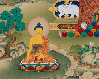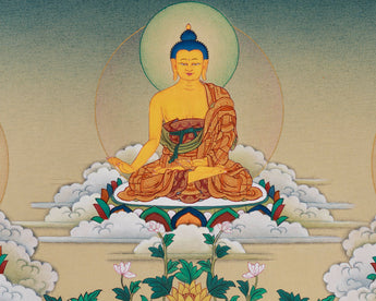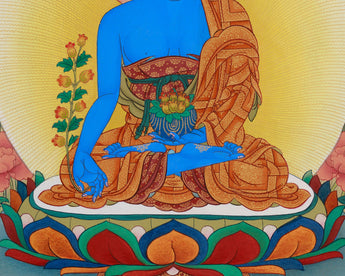An Eight Healing Buddhas thangka is a sacred artwork, meticulously hand-painted on cotton canvas with natural colors derived from Lhasa stone and enhanced with 24K gold. The mineral-based pigments from the holy region of Lhasa provide vibrant, long-lasting hues that bring each Buddha figure to life with spiritual clarity. The addition of 24K gold lends a radiant glow, symbolizing enlightenment and purity. It is created in the elegant Karma Gadri style, a traditional Tibetan technique characterized by flowing lines, balanced compositions, and serene landscapes.