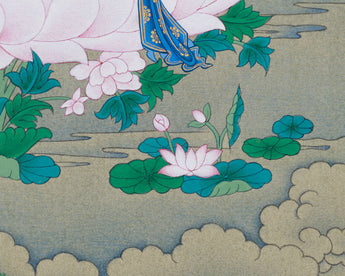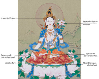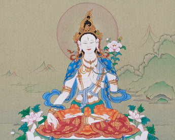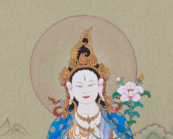 In Tibetan Buddhism and the broader Mahayana tradition, Sita Tara, also called White Tara, is regarded as a female Buddha of healing, compassion, and longevity. She is frequently called upon to guard against illness and untimely death. She is depicted in this thangka sitting elegantly on a moon disc upon a lotus seat, symbolizing spiritual purity. Her right hand is extended in the gesture of generosity (varada mudra). In contrast, her left hand holds a pundarika near her heart, an emblem of purity and the unfolding path of enlightenment.