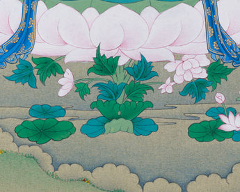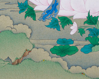 An original artwork of the female Buddha, Sita Tara Thangka, is meticulously hand-painted on fine cotton canvas using natural stone colors. It is also adorned with delicate accents made from genuine 24K gold. The use of naturally ground colors derived from minerals and stones gives the painting its soft, luminous texture. The gold highlights sacred elements like jewelry, robes, and background details. The painting adheres to the traditional Karma Gadri style, which is recognized by its open composition, flowing lines, and subtle shifts in tone. This style imparts clarity and elegance while beautifully presenting the main deity.