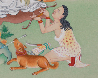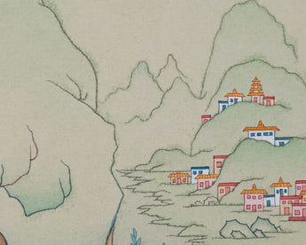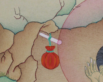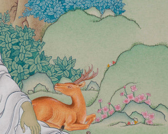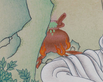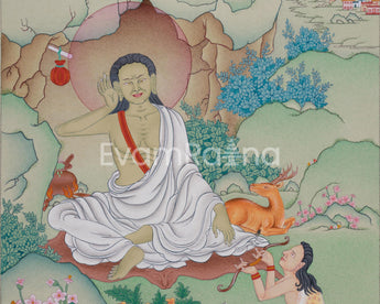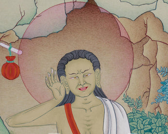 With one palm cupped to his ear, Milarepa is shown in this exquisite illustration sitting in a meditative position, signifying his command of poetry and music. The tranquil backdrop of the Himalayas echoes his modest life spent in solitude. His teachings of enlightenment and endurance are reflected in every way of his brilliant appearance and flowing robes. Radiating peace and knowledge, this Thangka is a wonderful addition to any meditation area, shrine, or spiritual practice.