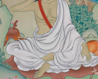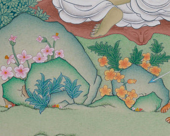 Revel in the timeless wisdom of Yogi Milarepa, the revered Tibetan sage and poet, with this Thangka. The spiritual soul of Milarepa is embodied in this artwork, which is created with natural stone hues on quality cotton canvas and decorated with genuine 24K gold. Honoring Milarepa's deep spiritual journey and teachings, the painting faithfully adheres to the meditation manual while being rendered in the traditional Karma Gadri manner.