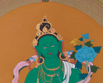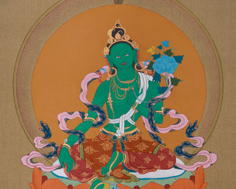 The Green Tara Goddess is a beautiful piece from our collection, made with exceptional artistic skill and attention to detail. Hand-painted on cotton canvas, this artwork features acrylic colors that produce soft gradients and vibrant layers, animating Tara's presence. Her jewelry and crown are painted from real 24K gold, highlighting sacred elements with a luminous quality that softly reflects light, imparting a dynamic and elevated essence to the thangka.