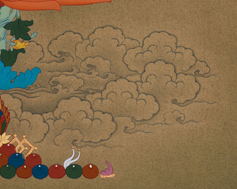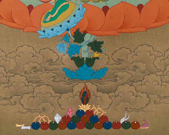 This artwork is created in the classic Karma Gadri style, linked to Eastern Tibetan art, celebrated for its otherworldly landscapes, gracefully proportioned figures, and airy, gentle compositions. Karma Gadri focuses on spiritual clarity, evident in the expansive serenity displayed in Tara’s flowing robes and scarves as well as the pastel hues of the halo and floral details. This artistic approach ensures that the central deity stands out as the focal point while harmoniously fitting into a sacred setting.