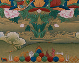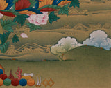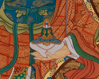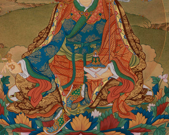 The Thangka beautifully portrays Guru Rinpoche, the Lotus-Born Master of Vajrayana. This artwork is intricately hand-painted using natural Lhasa stone pigments and authentic 24K gold on cotton canvas, created in the esteemed Karma Gadri style. Guru Rinpoche is illustrated in a divine pose, seated on a flourishing lotus pedestal, with a five-pronged vajra in one hand and a skull cup topped with a vase in the other. These symbols represent his dominion over spiritual realms and his transformative ability to convert ignorance into wisdom. The incorporation of 24K gold amplifies his enlightened aura, rendering this Thangka a potent source of blessings, wisdom, and protection.