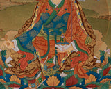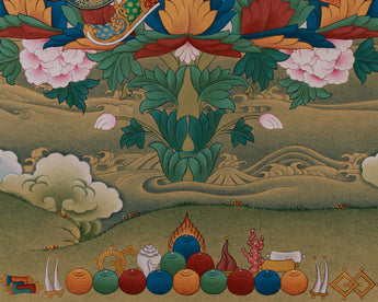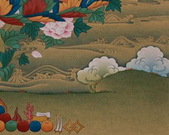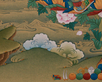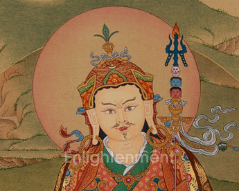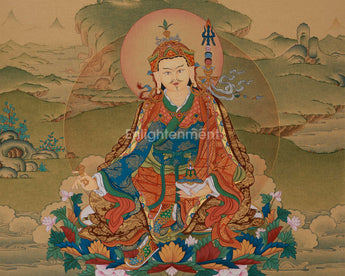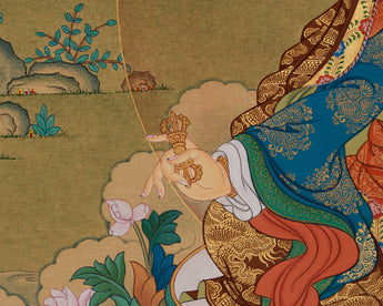 The natural hues of Lhasa stone featured in this Thangka impart a profound richness to the piece, anchoring it within Tibet's artistic and spiritual heritage. Meticulously applied 24K gold accents highlight Guru Rinpoche's divine essence, drawing attention to his Lotus Hat, katvanga, and the detailed designs on his robes. Surrounding him are vibrant lotus flowers, clouds, and a mountainous backdrop, all contributing to the artwork's tranquil and serene aura, fostering an environment conducive to reflection and spiritual advancement. These components unite to form a luminous, sacred masterpiece that functions both as a meditation tool and a distinctive art piece.