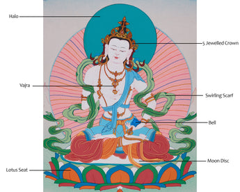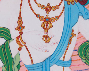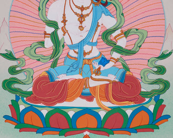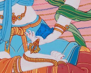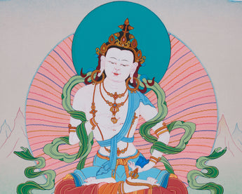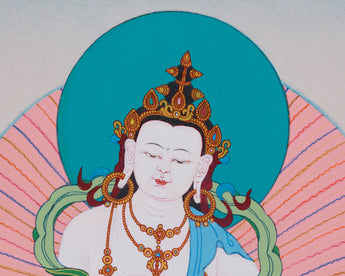 The Thangka features a traditional image of the Supreme Buddha Vajrasattva of Purification. Hand-painted using acrylic colors on canvas and embellished with real 24K gold highlights, this piece embodies traditional artistry while keeping a simple and accessible style. It is an ideal choice for individuals looking for an introduction to Vajrayana art and practice.