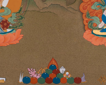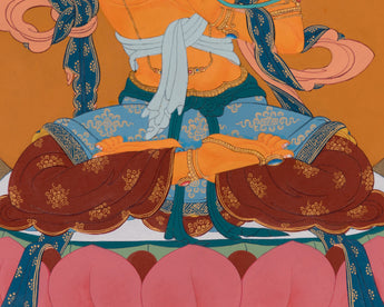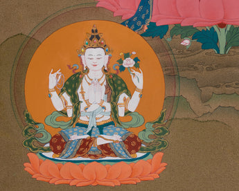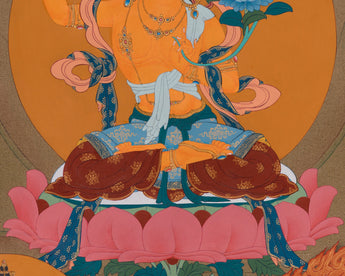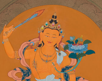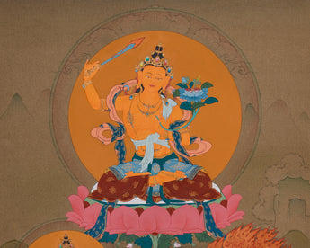 Our hand-painted thangka beautifully illustrates the Three Enlightened Bodhisattvas, Manjushri, Avalokiteshvara, and Vajrapani, in the traditional Karma Gadri style. Meticulously created as described in the meditation manual, this artwork conveys the divine qualities of these Bodhisattvas with remarkable detail and spiritual significance. Using acrylic color and genuine 24K gold, the thangka embodies the radiant energy and transformative presence of these revered figures.
