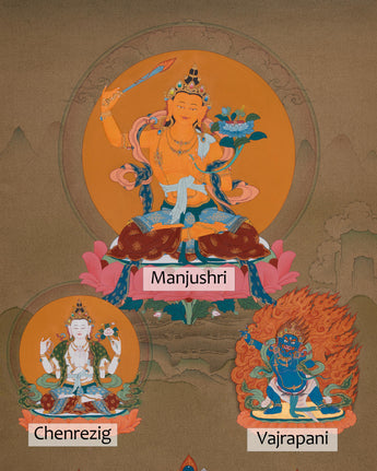 Sacred Assembly of Three Enlightened Bodhisattvas: Manjushri (Wisdom), Avalokiteshvara (Compassion) & Vajrapani (Power)