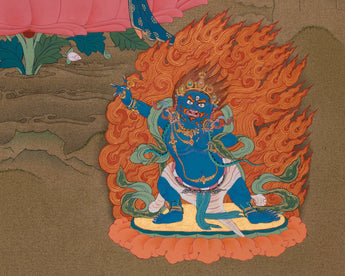 At the center, Manjushri holds the sword of wisdom, symbolizing the cutting of ignorance, and sits gracefully on a lotus seat. Beside him, Avalokiteshvara, the embodiment of compassion, gazes with a profound expression of mercy, offering hope to all sentient beings. On the opposite side, Vajrapani, the protector, stands resolute, encircled by flames representing his fierce and unwavering power to guard against harm. Each deity's posture, hand gestures, and accompanying symbols are intentionally crafted to deepen your meditation practice, allowing you to connect with their respective energies.