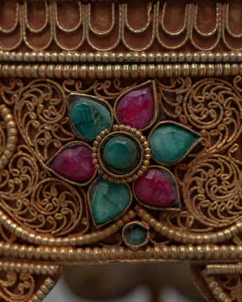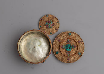 This circular treasure box is carefully constructed on a copper body and lavishly plated in 24k gold. The surface is embellished with beautiful gemstones carefully embedded to form an exquisite design. The box's lid is simple to open and reveals a large compartment that can keep little items. This wonderful work of art not only acts as a useful piece of art but also as a gorgeous decorative object that adds a sense of elegance to any environment.