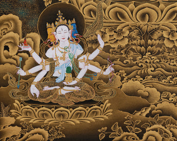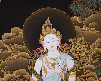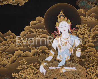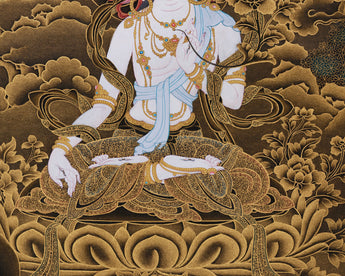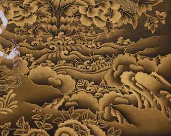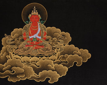 The black canvas, as a dramatic backdrop, highlights the glowing gold elements, producing a depth and light interplay. Gold decorations and elaborate patterns increase the composition's spiritual importance in this elegant Nakthang style, a trademark of Tibetan Buddhist art. Every element, from the celestial motifs to the deities' ornate adornments, has been meticulously hand-painted by a master artist trained in the sacred traditions of Buddhist thangka creation. This work transcends mere aesthetics for practitioners and collectors alike, offering a gateway to the divine essence of Buddhist philosophy and tradition.