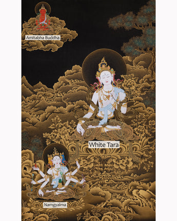 White Tara, the compassionate mother, exudes calm and restorative energy, and her tender gaze embodies unending compassion. The Buddha of Infinite Life, Amitayus, is depicted holding his holy vase of nectar, which represents vigor and longevity. With the promise of freedom and endless life, Namgyalma, the deity of enlightenment and purification, shines like a lighthouse of spiritual illumination.