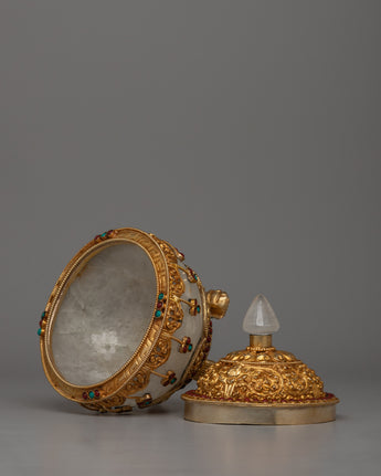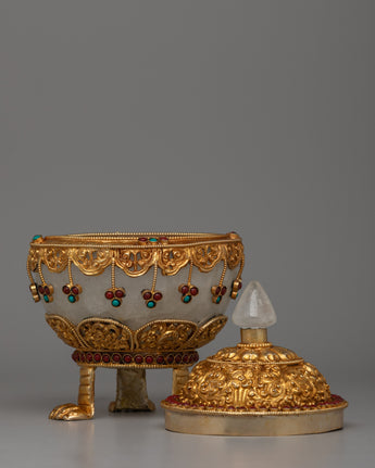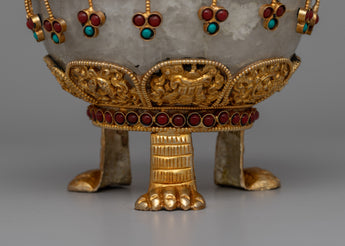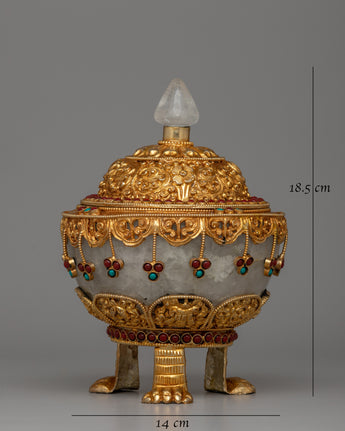 This rice pot represents abundance and prosperity, making it an excellent centerpiece for rituals, ceremonies, or sacred areas. The crystal provides purity and clarity, while the vibrant turquoise and coral stones balance color and meaning perfectly. Whether used as a ceremonial vessel or a decorative treasure, this item brings a timeless touch of spirituality to any collection or place.