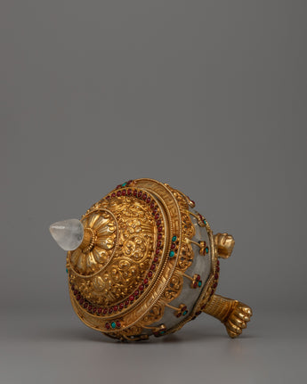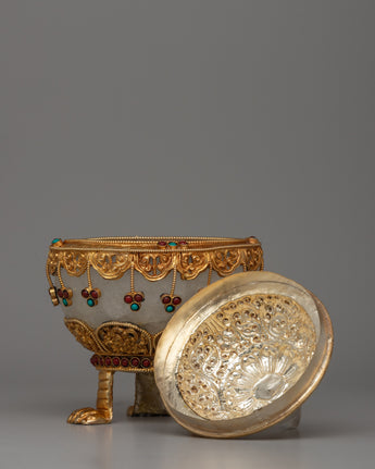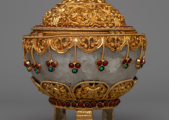 Discover the elegance and cultural value of this Gold-Plated Three-Side Stand Rice Pot, an outstanding item made of copper with gold plating and decorated with crystals and semi-precious stones like turquoise and coral. This gorgeous rice pot, which measures 18.5cm in height and 14cm in breadth and weighs 1.18kg, is supported by a distinctive three-sided stand with exquisite motifs and superb craftsmanship.
