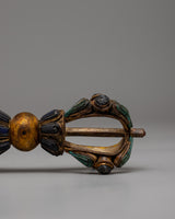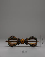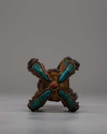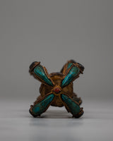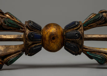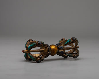 Our Tibetan Vajra is an enduringly beautiful emblem of great spiritual significance, carefully created with every detail in mind. This holy object was crafted by hand from copper and is embellished with genuine lapis lazuli, turquoise, and coral stones that have all been painstakingly inlaid to amplify its spiritual power and visual appeal. Its weight of 0.206 kg gives it a tangible presence and makes it an effective tool for ritual, meditation, and spiritual development.