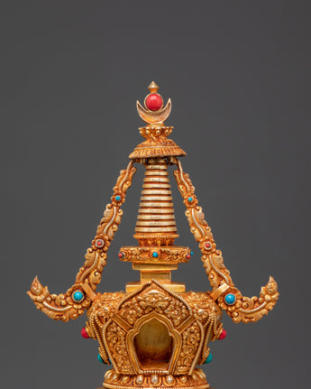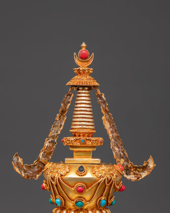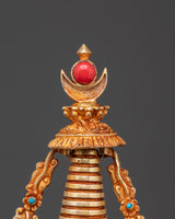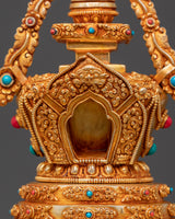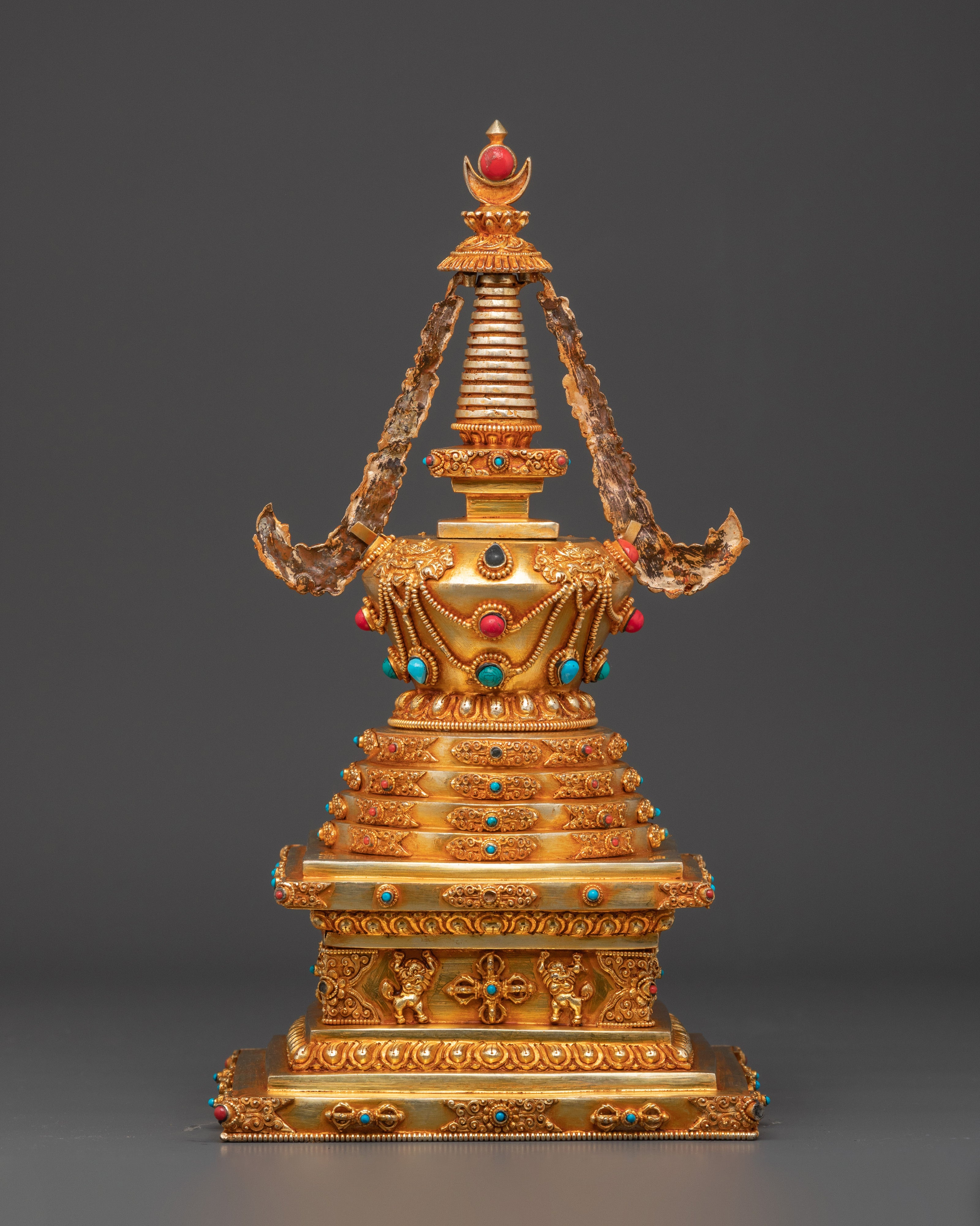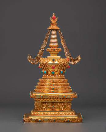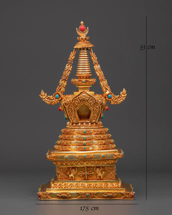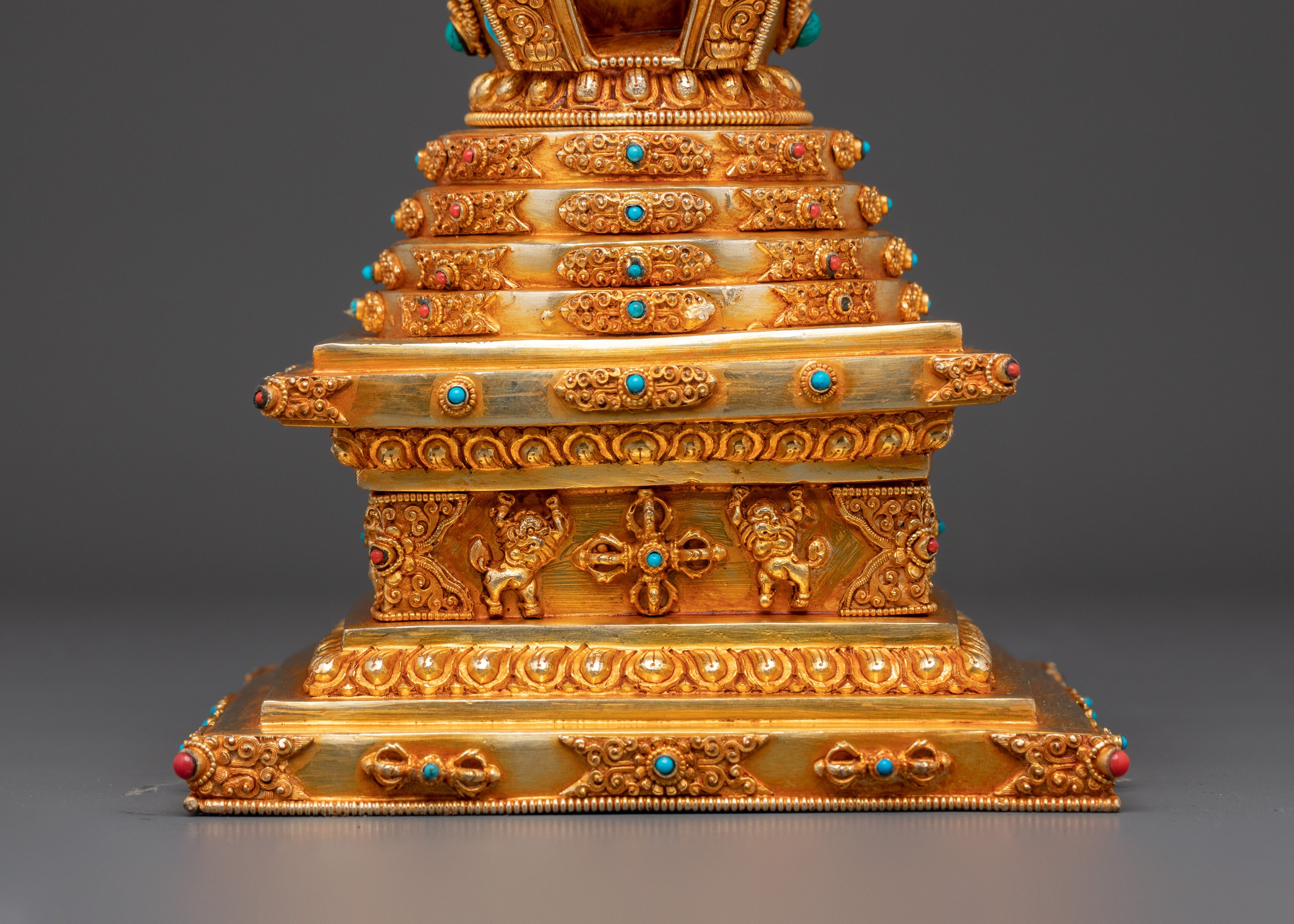 Emanating divine beauty and sacred energy, this Tibetan Buddhist chorten radiates divine beauty and sacred energy, functioning as a powerful spiritual sanctuary. It is handcrafted from copper and features extensive gold plating to honor traditional Himalayan design. With a height of 33 cm and a weight of 1.49 kg, it is embellished with artificial turquoise and coral stones, symbolizing purity and spiritual awakening. The layered base, intricate lotus-petal engravings, and bejeweled spire exemplify its sophisticated craftsmanship and profound ritual significance.