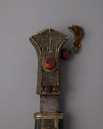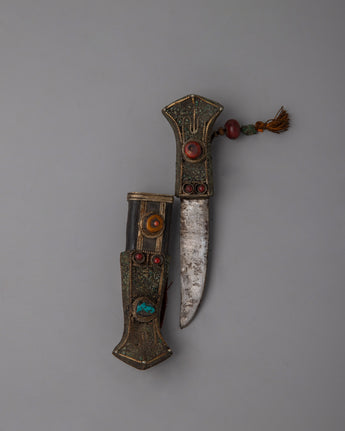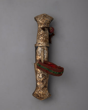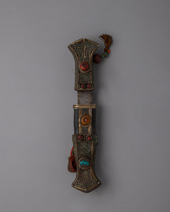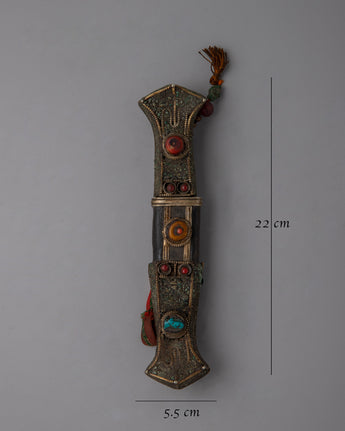 In Buddhist rituals, the knife is used as a symbolic tool to cut away ignorance and negative energy. The colorful turquoise and coral accents provide cultural depth, and are thought to provide protection and healing energy. This extremely crafted knife is great for anyone who value Tibetan Buddhism's spiritual and cultural legacy, making it suitable for ceremonial usage or as a sacred decoration.