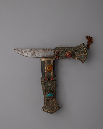 In Tibetan traditions, a Tibetan knife, also called a "phurba" or "kila," has cultural and symbolic meaning. The unique three-sided blade of this ceremonial dagger represents the victory over ignorance, desire, and aversion in Buddhism. Tibetan knives, which are adorned with elaborate carvings and frequently have a tripartite handle that represents different gods, are an essential part of religious rites, ceremonies, and spiritual practices. In addition to their spiritual significance, these knives might have practical uses in daily life, exhibiting in Tibetan communities a combination of deep cultural symbolism and usefulness.