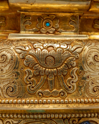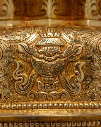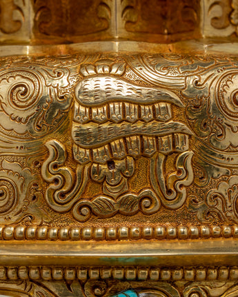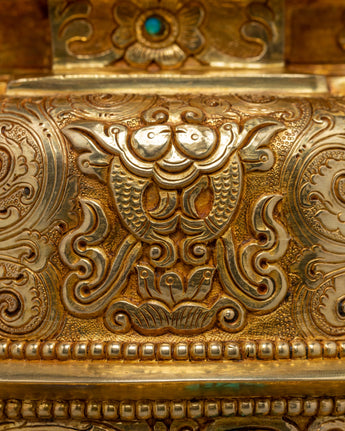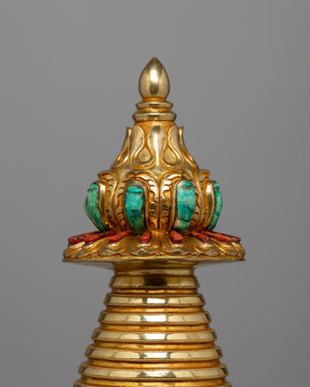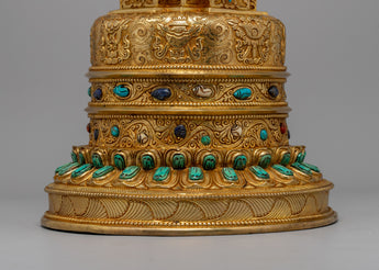This Tibetan Buddhist Kadampa Stupa is a revered representation of wisdom and enlightenment that will enhance your spiritual environment. This handcrafted stupa is a stunning and long-lasting addition to your house or meditation space. It has a sturdy copper body and is tastefully coated in 24k gold.