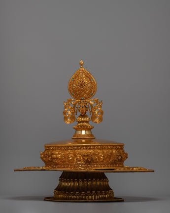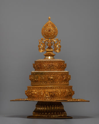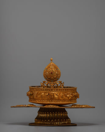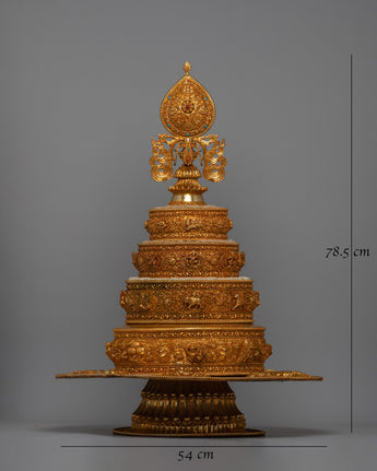 The Tibetan Buddhist Mandala Offering Set is an outstanding piece made of high-quality copper that has been gold-plated to enhance its divine presence and spiritual resonance. With a height of 78.5 cm, a width of 32.5 cm, and a base of 54 cm, this set weighs 11.45 kg and is a significant and treasured object in Buddhist rituals and ceremonies. The use of copper as a foundation material provides strength and longevity, while gold plating adds holiness and aesthetic value, making it an ideal offering for meditation and prayer.
