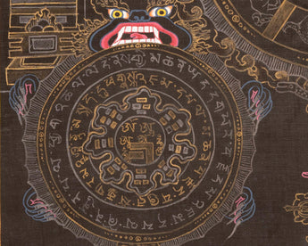 Tibetan Calendar Hand Painted with 24k Gold This Thangka is used as an instructional tool and auspicious talisman. The stylized astrological chart brings good fortune to all those who possess it, see or display it. The painting is a collection of astrological, calendar, and primary element symbols. The central image is of a yellow tortoise - emanation of the bodhisattva Manjushri. It's lying on the back with the head to the top and the four limbs extended holding sticks with frogs.