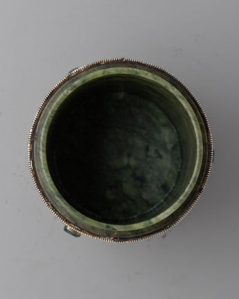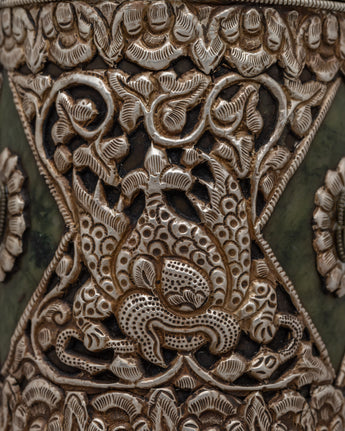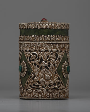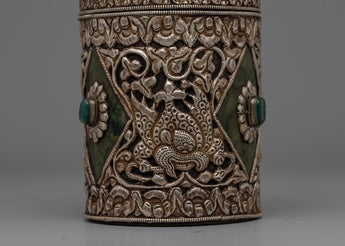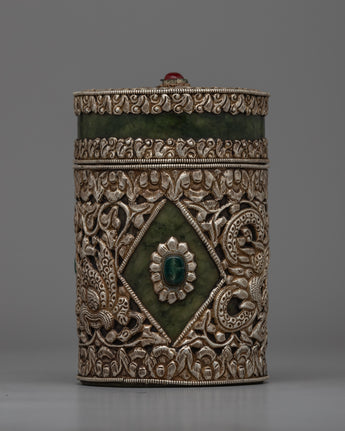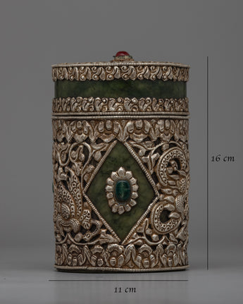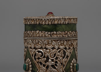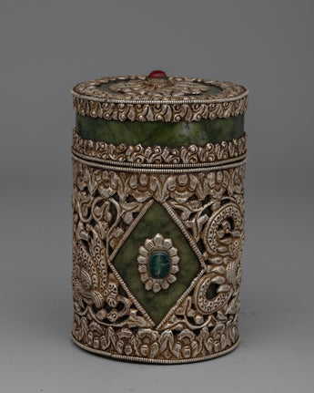 The box is further embellished with finely carved jade stones set into the silver front. The jade gives the silver a striking contrast, enhancing the box's aesthetic appeal and cultural relevance. The fine craftsmanship and meticulous attention to detail characteristic of Tibetan ornamental arts are exemplified by this inlay work. The Tibetan Circular Box is a beautiful ornamental piece in addition to a useful storage container. It adds value to any collection and adds a touch of sophisticated culture to any area thanks to its creative design and traditional material blend.