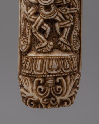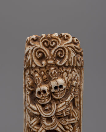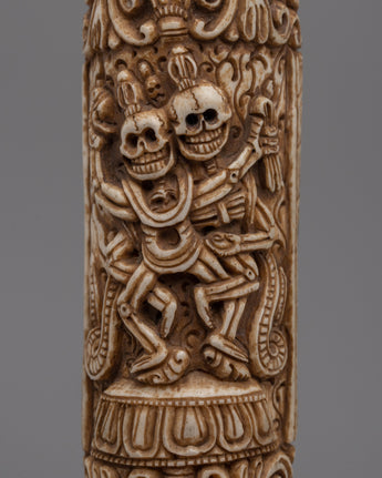 Embrace the profound truths of impermanence with this hand-carved Tibetan Citipati Mythical Decor, created from ethically sourced buffalo bone. This skeletal god, known as the "Lord of the Cemetery," carries great spiritual significance in Tibetan Buddhism. With elaborate workmanship and symbolic beauty, it serves as a strong reminder of life's fleeting nature and the journey to enlightenment.
