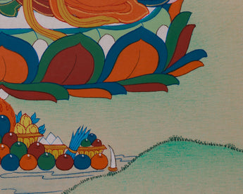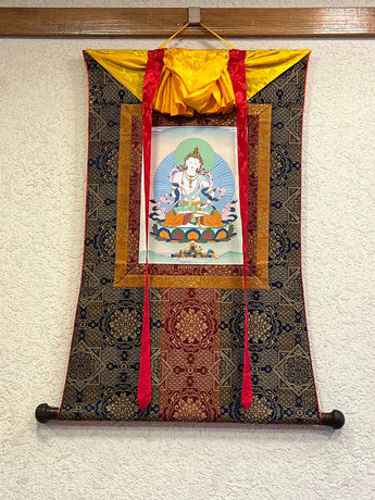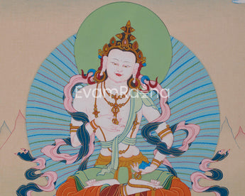 Discover the profound symbolism and spiritual energy of the Tibetan Dorje Sempa Thangka, a revered representation of Vajrasattva, the purification Buddha. It embodies the essence of purification and transformation in Vajrayana Buddhism. Following the traditional Karma Gadri style, it is hand-painted with vibrant acrylic colors and embellished with 24K gold on high-quality cotton canvas.
