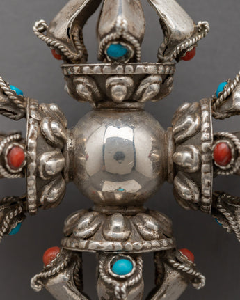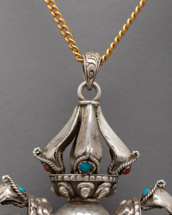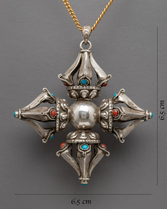 Step into the realm of mystique with the Tibetan Double Vajra Locket, skillfully handcrafted on a gleaming silver body. This enchanting locket features the iconic Double Vajra symbol, a representation of supreme spiritual power and indestructibility in Tibetan Buddhism. Intricately designed, the locket showcases small stones artfully inlaid, adding a touch of sparkle and elegance.