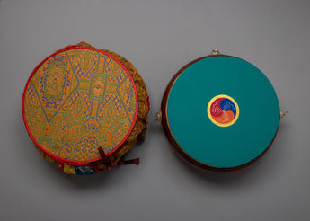 The matching bass drum, made of sustainably sourced yak leather, enhances the ensemble's authenticity and cultural relevance. Yak leather is noted for its toughness and ability to generate deep, resonant tones, making it an excellent choice for bass drums. The combination of timber platform and yak leather drum creates a balanced blend of robustness and great acoustic qualities.