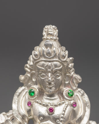 This Tibetan Dzambhala Wealth Deity Statue, a finely carved representation of the Wealth God, will bring wealth and prosperity into your life. This spiritual statue, crafted from 98% silver, measures 6 cm in height and 4.5 cm in width. It is designed to increase wealth and financial success by depicting Dzambhala, the Buddhist deity associated with abundance and fortune, in detail. The statue is adorned with gemstones around its neck, symbolizing the flow of money and positive energy.