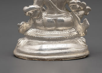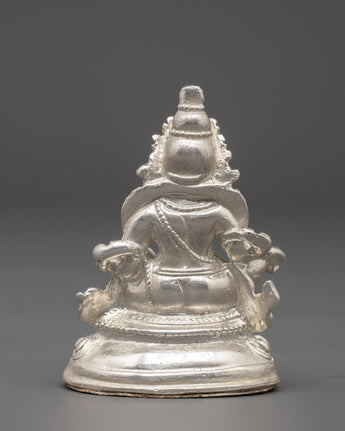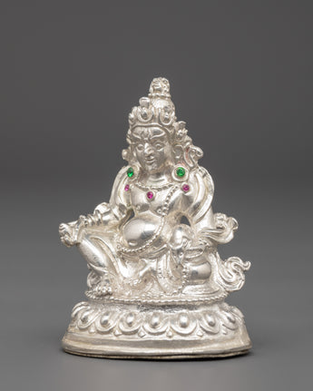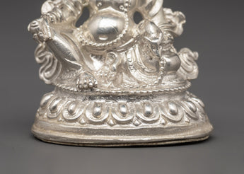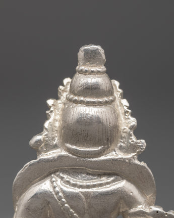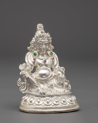 Crafted with great care, this handcrafted silver figurine is ideal for your home altar, meditation place, or as a beautiful gift to bring blessings into a loved one's life. Dzambhala's presence, whether displayed as a prosperity symbol, employed during rituals, or simply as a piece of spiritual house decor, promotes financial success, well-being, and fortune. This statue serves as a reminder of Buddhist teachings on abundance and the importance of cultivating generosity and gratitude in one's life.