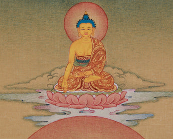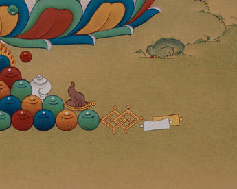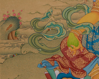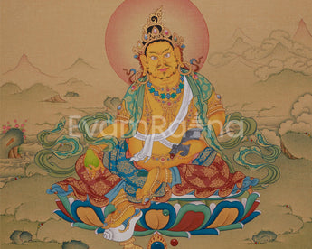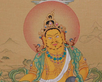 His golden body represents compassion and God's ability to grant material and spiritual wealth. He wears a five-jeweled crown that symbolizes the five wisdoms, with silk garments accentuating his divine status. An utpala garland signifies purity, while his right-hand holds a citron fruit for fortune, and his left-hand grips a mongoose spitting jewels, representing infinite wealth. The conch shell and vase beneath him symbolize the continuous flow of rewards. Above Dzambhala, Ratnasambhava Buddha sits on a lotus base, symbolizing the Buddha's calmness and kindness. His blessings radiate from the lotus, a symbol of spiritual purity and enlightenment. This sacred Dzambhala thangka is not only a source of benefits but also a stunning visual creation that fosters kindness and inner growth.