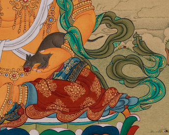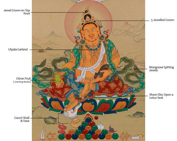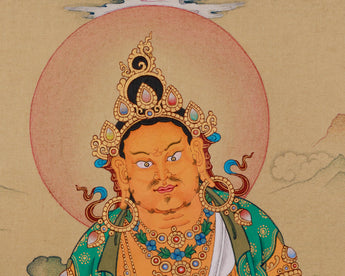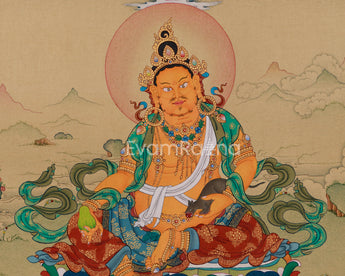 His golden body represents compassion and God's ability to grant material and spiritual wealth. He wears a five-jeweled crown that symbolizes the five wisdoms, with silk garments accentuating his divine status. An utpala garland signifies purity, while his right-hand holds a citron fruit for fortune, and his left-hand grips a mongoose spitting jewels, representing infinite wealth. The conch shell and vase beneath him symbolize the continuous flow of rewards. Above Dzambhala, Ratnasambhava Buddha sits on a lotus base, symbolizing the Buddha's calmness and kindness. His blessings radiate from the lotus, a symbol of spiritual purity and enlightenment. This sacred Dzambhala thangka is not only a source of benefits but also a stunning visual creation that fosters kindness and inner growth.